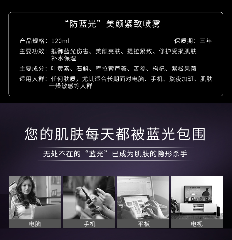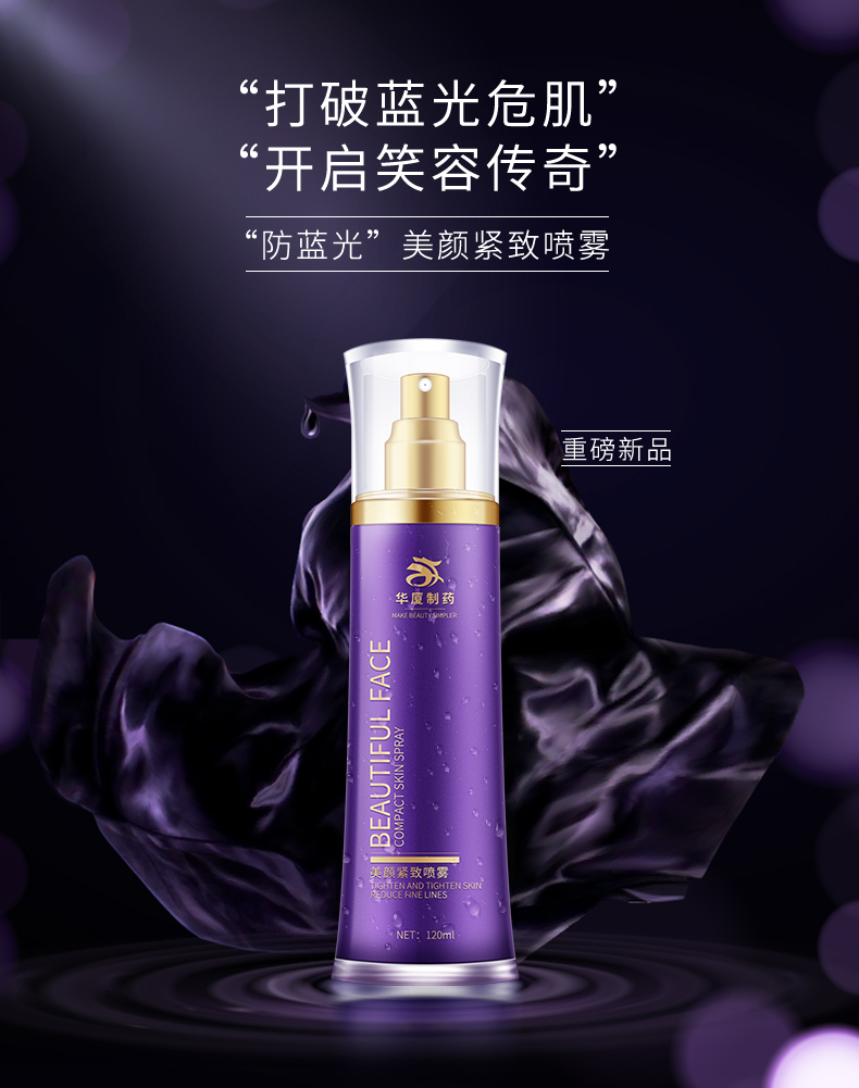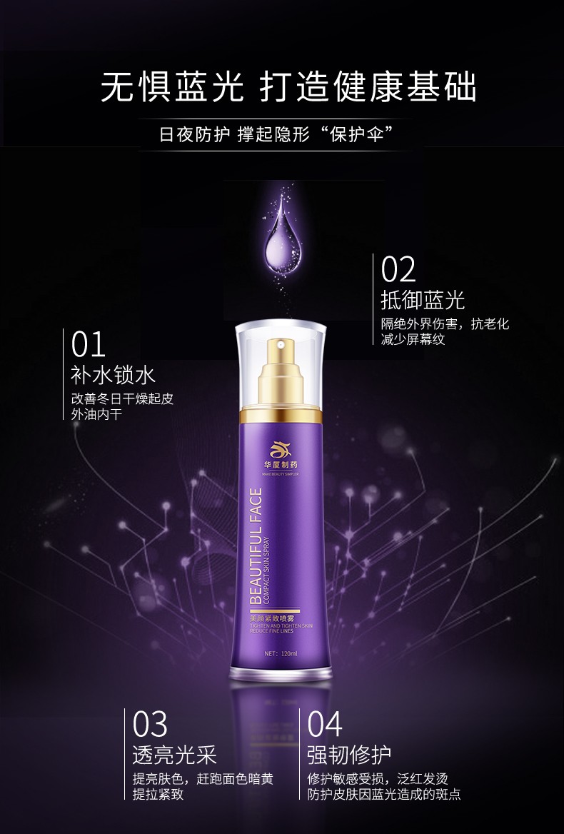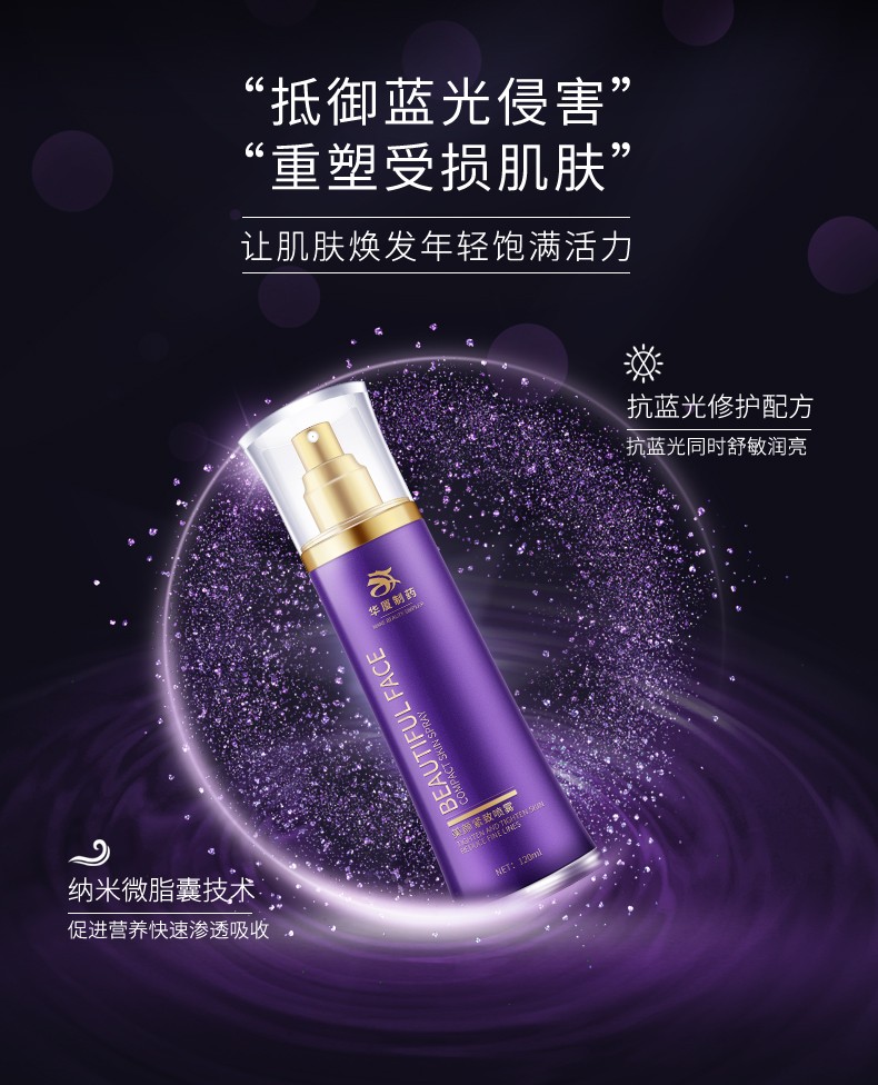 華廈防藍(lán)光緊致噴霧特含葉黃素。葉黃素被稱(chēng)為藍(lán)光隔離使者,過(guò)濾生活中的藍(lán)光,強(qiáng)有力的抗氧化作用,防老化。