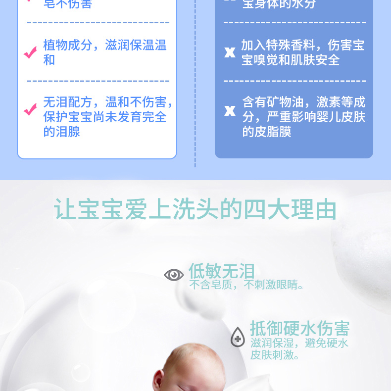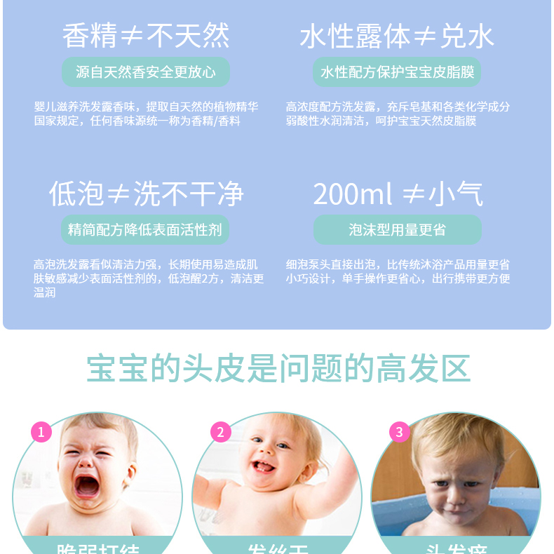 同時(shí)也能更好地清潔皮膚,含有無(wú)淚配方的嬰幼兒洗發(fā)露不僅對(duì)眼睛沒(méi)有任何刺激,還能有效保護(hù)頭