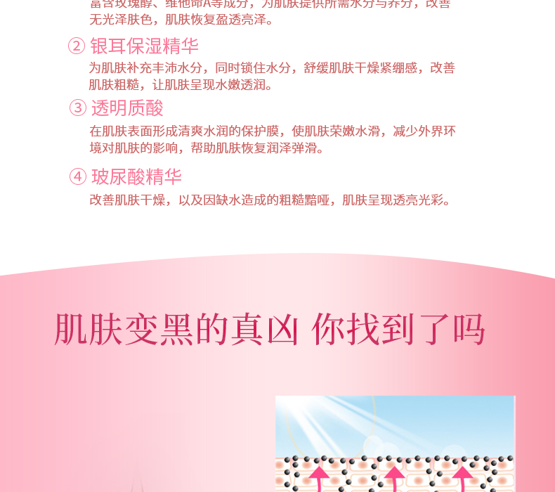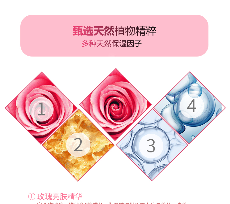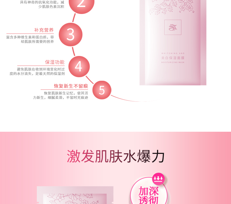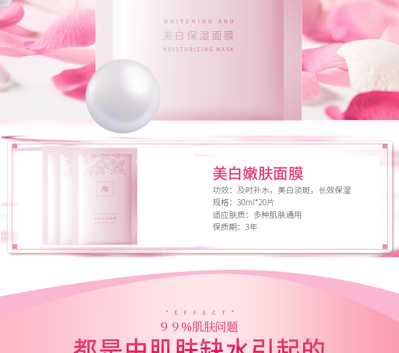 美白保濕面膜甄選天然植物精粹和多種天然保濕因子,包含玫瑰亮膚精華、銀耳保濕精華、透明質(zhì)酸、玻尿酸精華。美白保濕面膜五大功效,肌膚再生、抗氧化、補充營養(yǎng)、保濕功能、恢復(fù)新生不留痕跡。