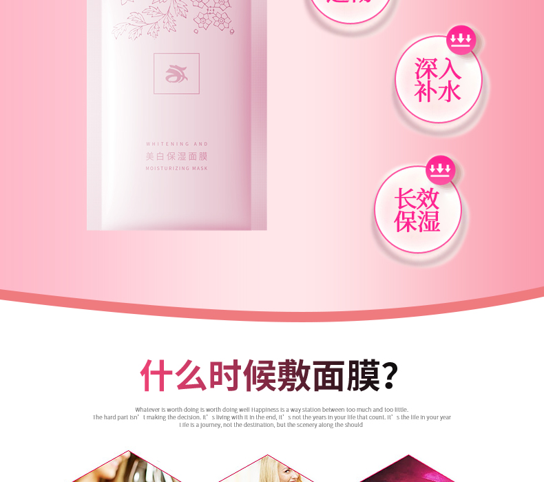 美白保濕面膜在什么時候使用最為合適?無論平時逛街后、上班、下班了晚上約飯后、酒席宴會后,即刻敷膚個面膜補補水都是沒問題的。
